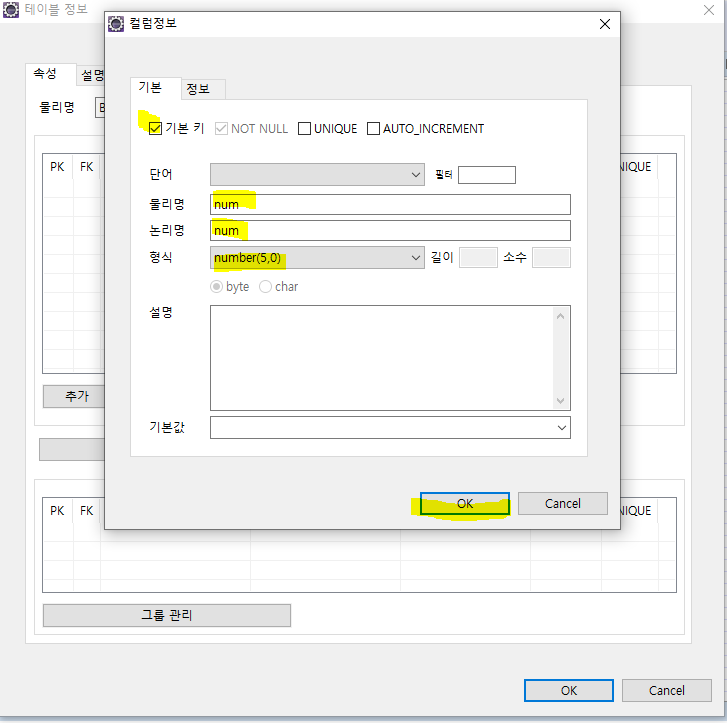 - 테이블 클릭 > 모눈종이위에 일정크기를 드레그로 만들고 해당테이블 더블클릭 > 추가 클릭 > 원하는 옵션을 선택하여 태이블의 필드를 줄 수 있습니다. ( pk : 기본키(금색 열쇠), fk : 외래키(은색 열쇠) )