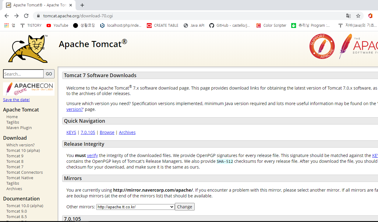 - 설치 순서 : 어파치 톰캣을 검색합니다. 아래와 같은 창이 나오면 잘 찾아가신겁니다.
