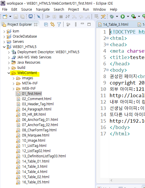 - 새로 생긴 프로젝트의 내부에서 html 파일을 생성해서 테스트합니다. 반드시"WebContent"에 생성합니다.