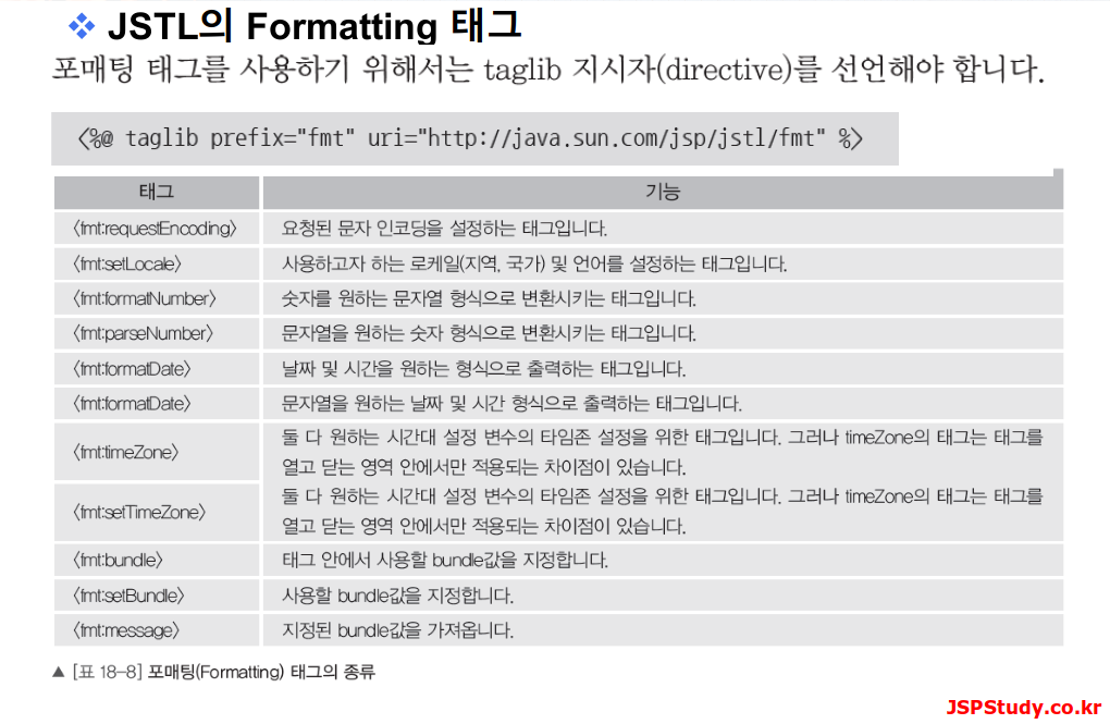 <%@taglib prefix="fmt" uri="http://java.sun.com/jsp/jstl/fmt" %> // formatting 태그 임포트