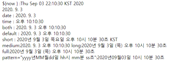 default : <fmt:formatDate value="${now }" type="both" dateStyle="default" timeStyle="default"></fmt:formatDate><br>