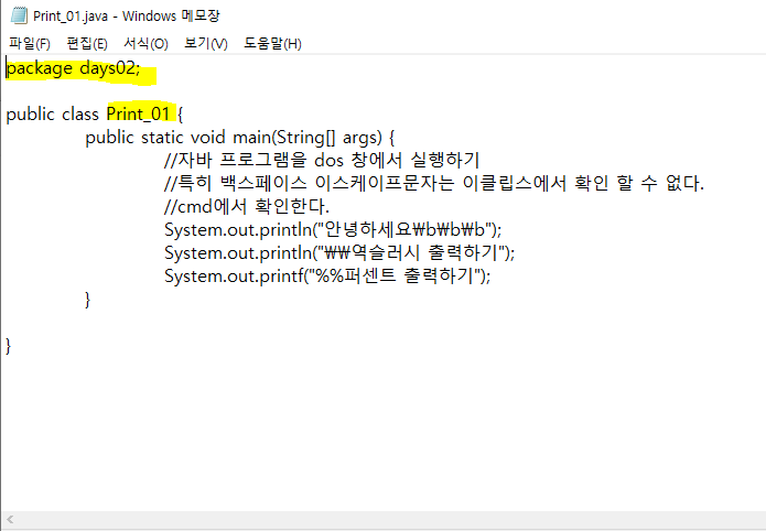1. 이클립스나, 메모장으로 자바 코드를 입력하여 저장합니다.