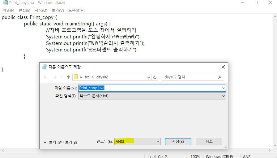 3. 다른 이름으로 저장할 때 인코딩을 ANSI(이클립스는 ANSI를 사용)로 해줄 것!