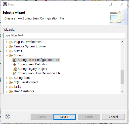 방법: 스프링 파일의 해당 패키지 마우스 우 > new > other > spring 폴더 > Spring Bean configuration File 클릭