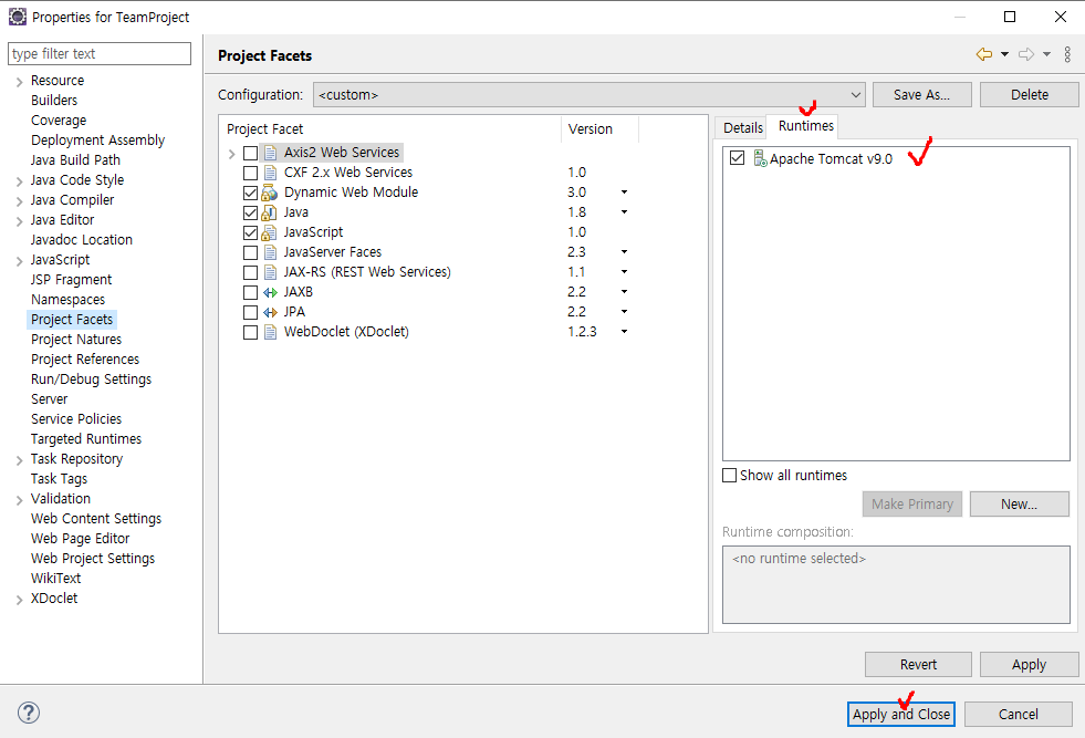 [방법] : 프로젝트 마우스 우 > Properties > Project Facets 이동 후 Runtimes > 해당 톰캣 설정 > 저장