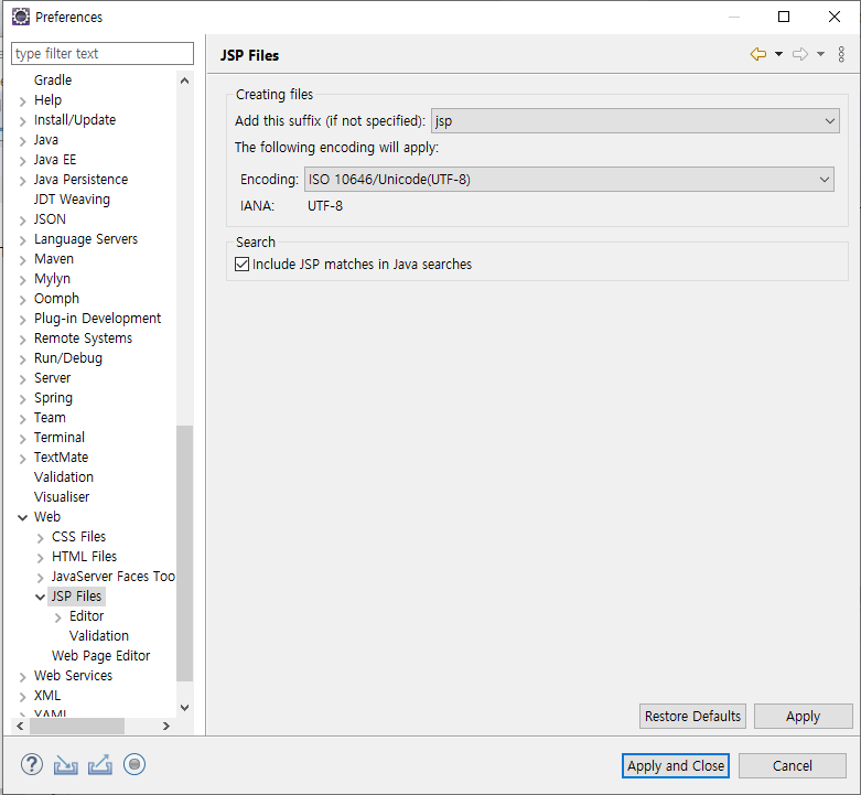 [설정 4] : Windows -> Preferences -> Web -> JSP Filse -> ISO 10646/Unicode(UTF-8) 선택