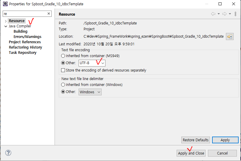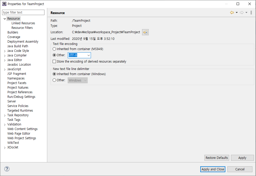 [설정 5] : Project - Properties - Resource - Text file encoding에서 UTF-8 선택
