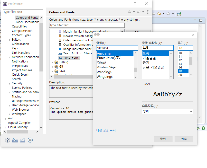 저는 Verdana글꼴과 18 정도의 사이즈를 선호합니다. > 선택 후 > 저장