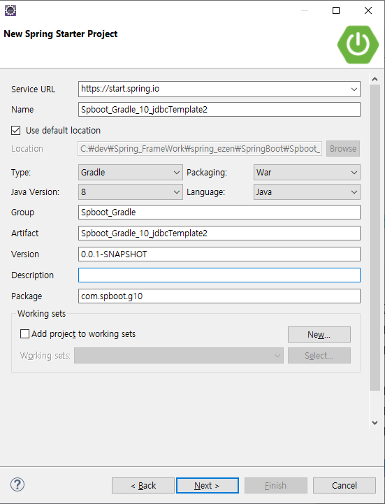 (2) 프로젝트명, 패키지 사용언어나 버전 등을 알맞게 설정합니다.