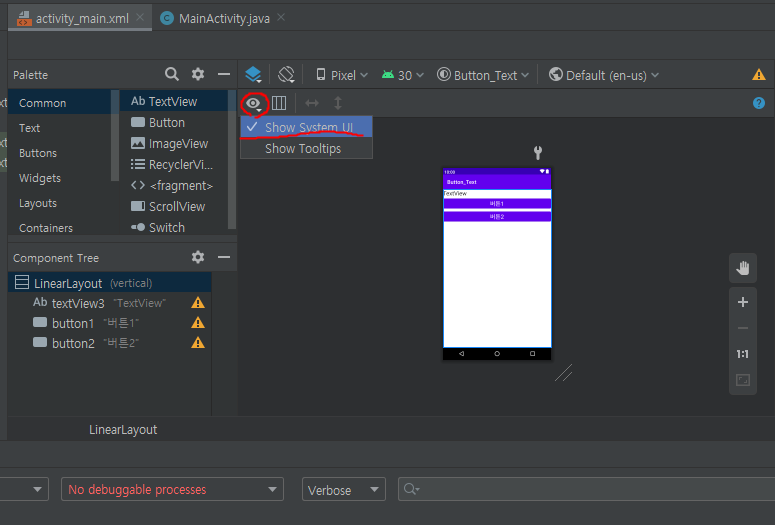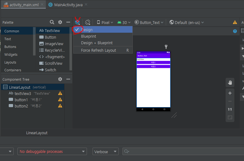 (1) activity_min.xml 설정 : 리니어 레이아웃으로 바꾸기.