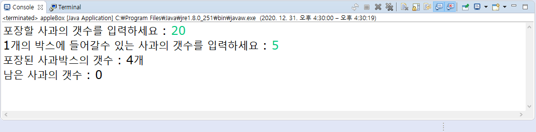 System.out.println("포장된 사과박스의 갯수 : " + mok + "개");