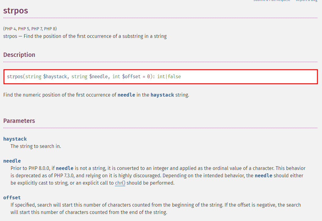 - PHP 메뉴얼에서 검색해 보면 strpos() 함수의 원형은 이렇습니다.
