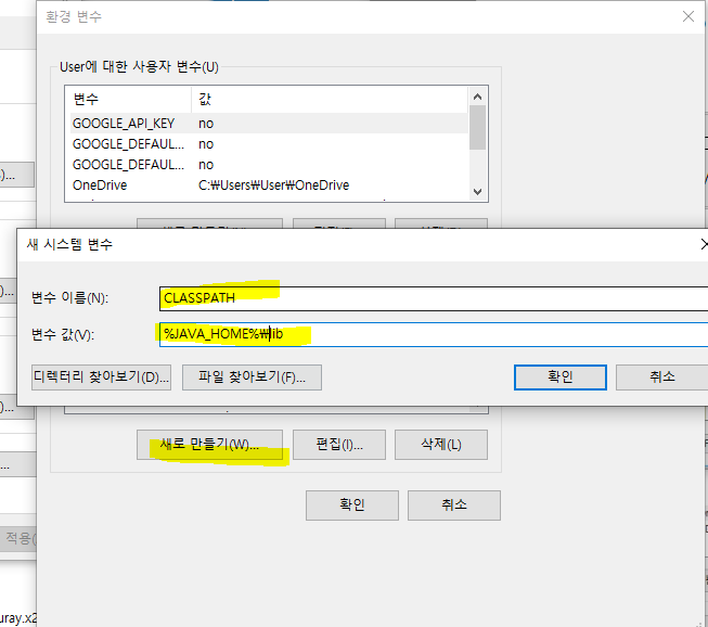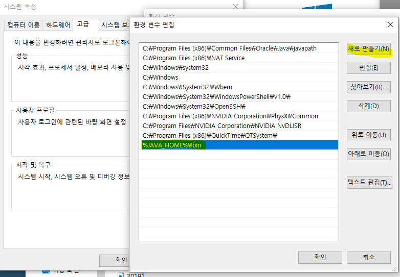 2. 환경변수 - 시스템변수(s)- Path 를 찾아 더블클릭! - 새로만들기 - %JAVA_HOME%\bin - 확인