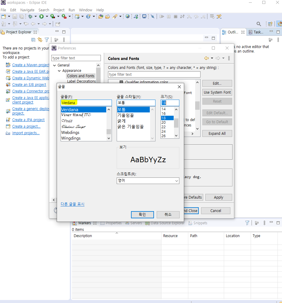 # 코딩창 폰트 크기변경: window-Preferences-General-Appearance-Colors and Fonts-java-java Editor Text Font